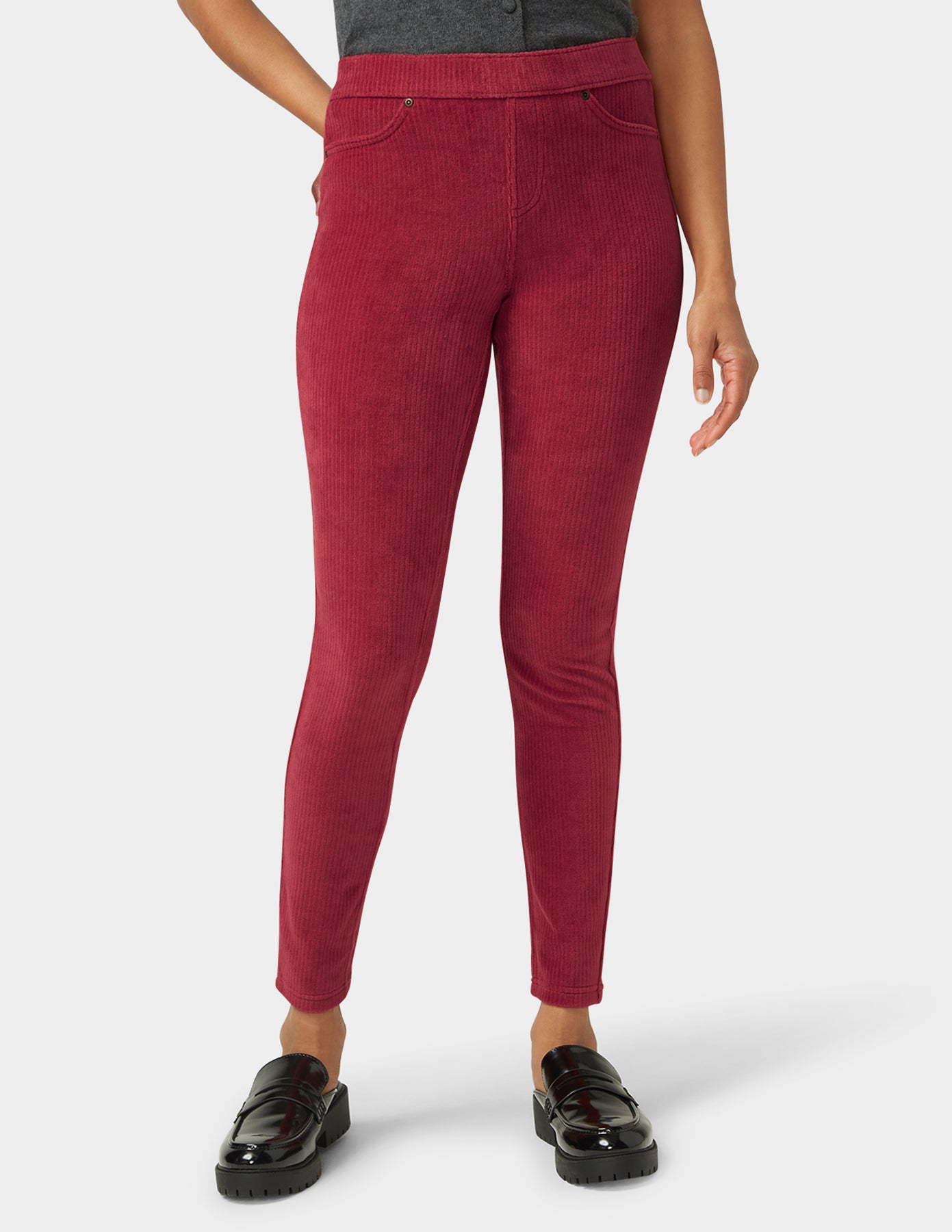 Turn heads with these fashionable corduroy leggings that feature a snug, comfortable stretch fit. Sleek thin-wale corduroy material will have you looking stylish. Wider waistband and stretchable ultra soft fabric allow a versatile range of motion, unlike traditional corduroy material. Wear them to work with a dressy top, or get casual and relaxed and pair with a tunic or shirt. Featuring a 29" inseam.