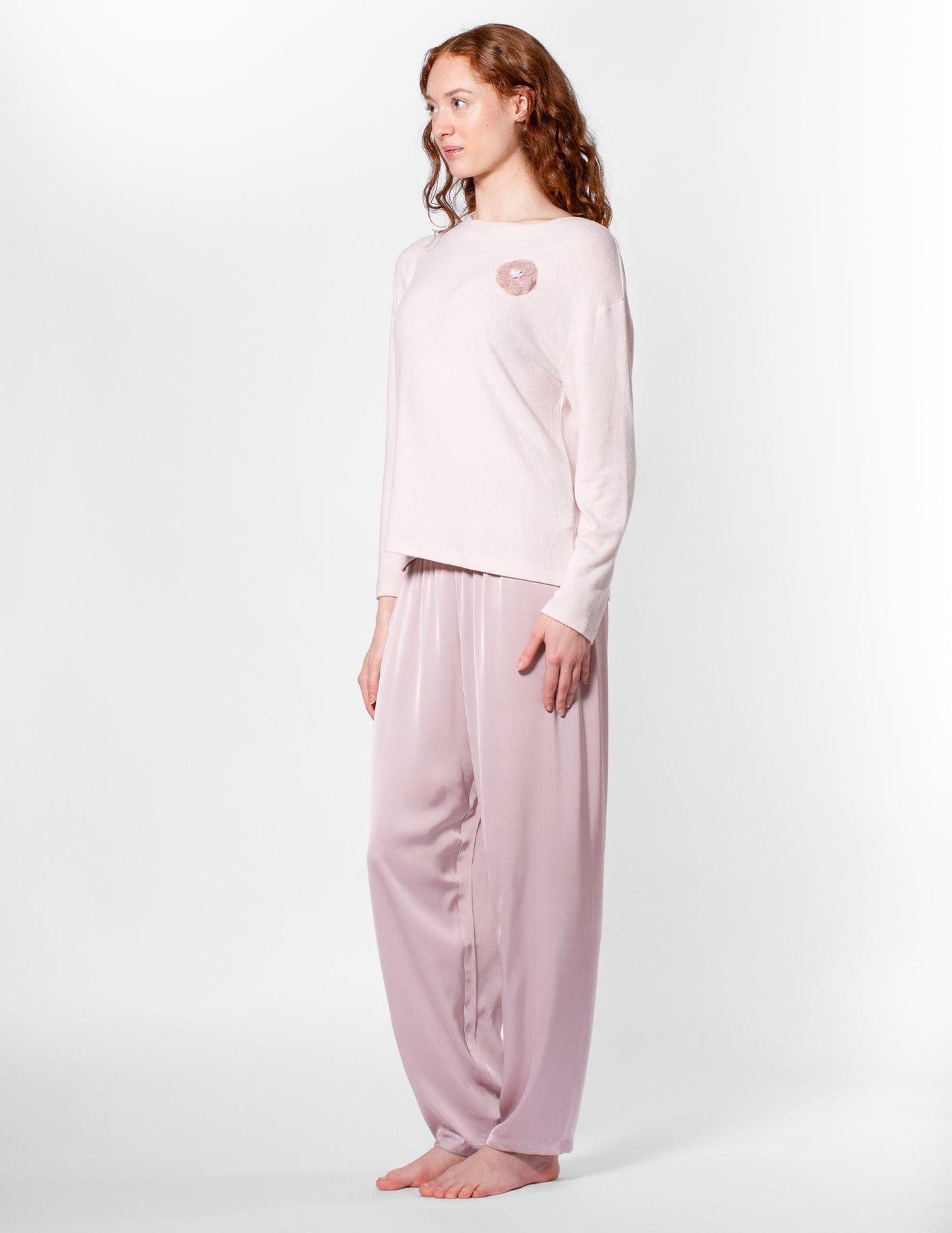 Light pink long-sleeve top and wide-leg pants on a plain background