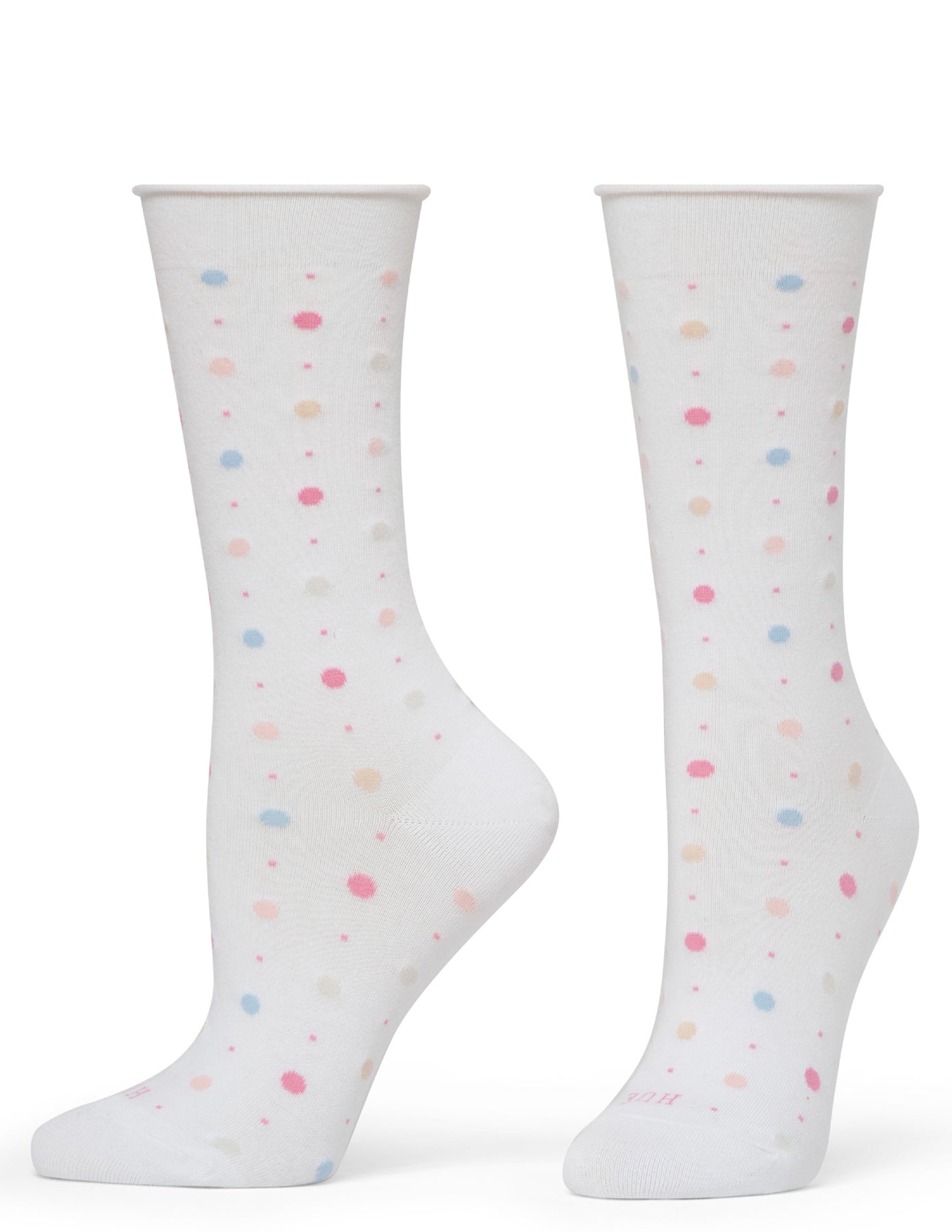 White pair of socks with colorful dots on white background