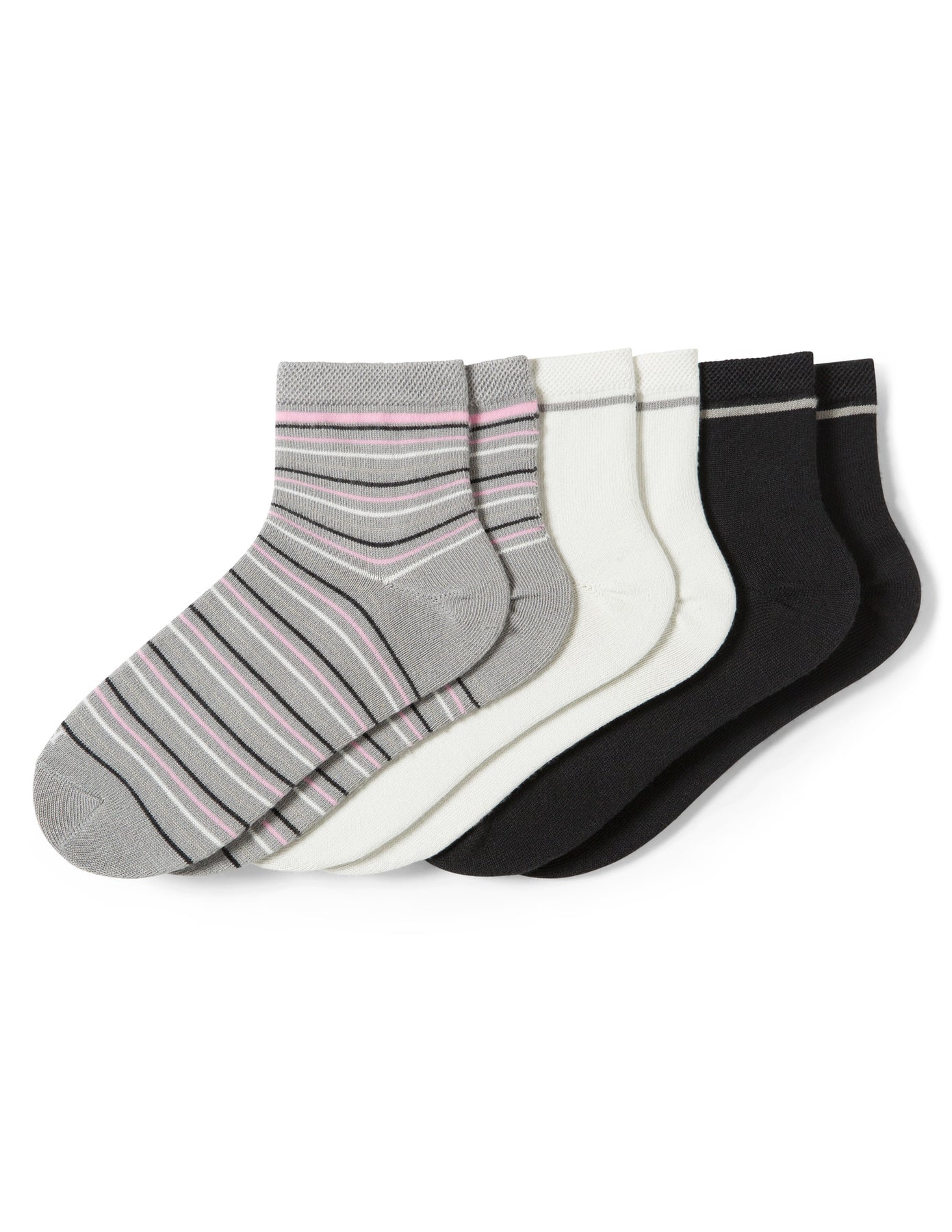 Three pairs of socks in black, white, and gray with pink stripes on a white background
