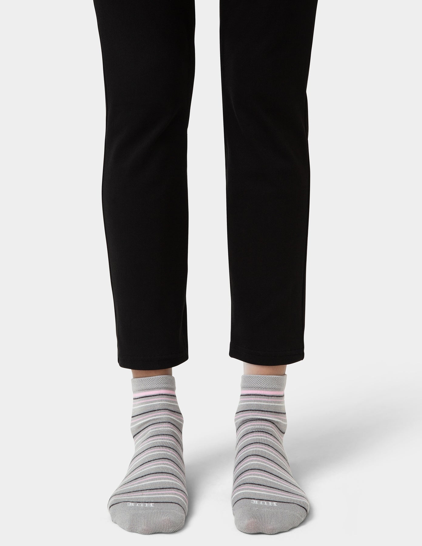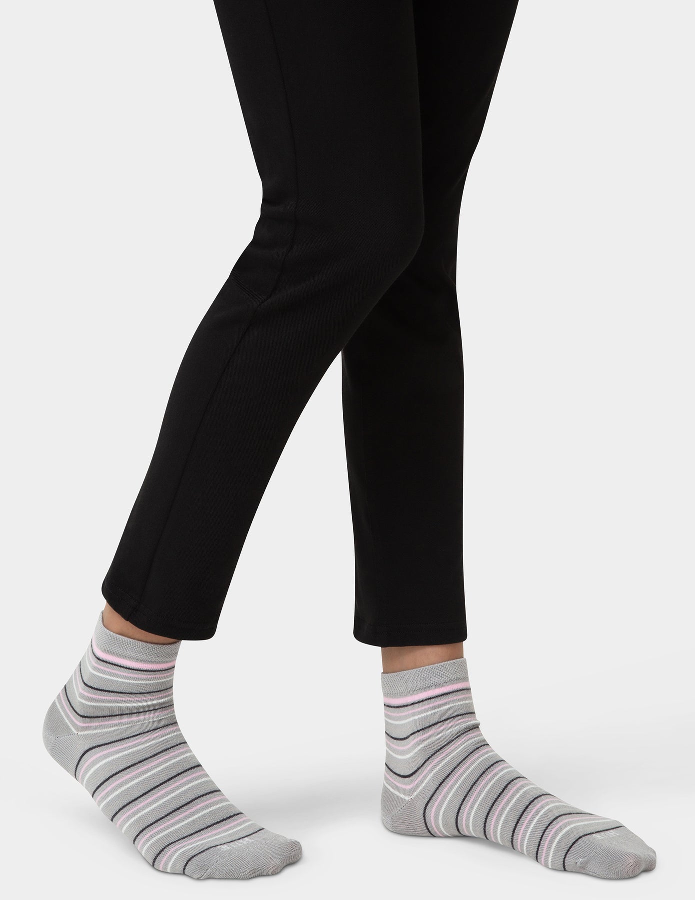Person wearing black pants and gray striped socks on a white background