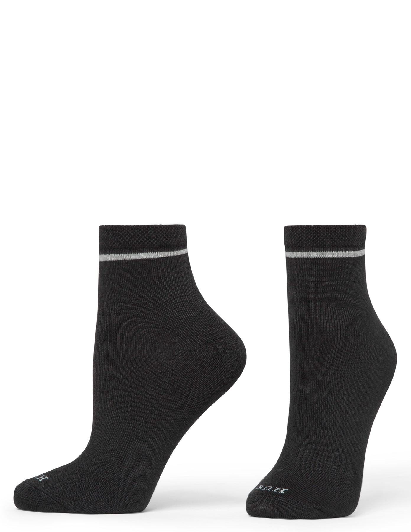 Pair of black socks with a thin white stripe on a white background