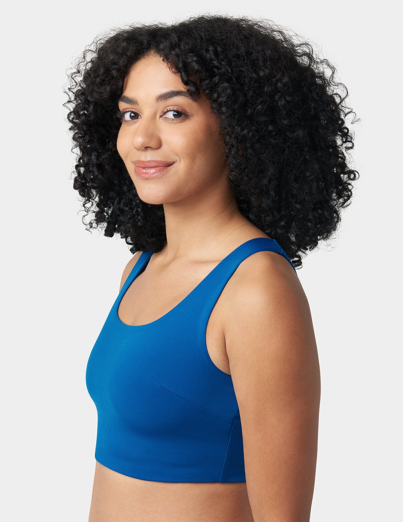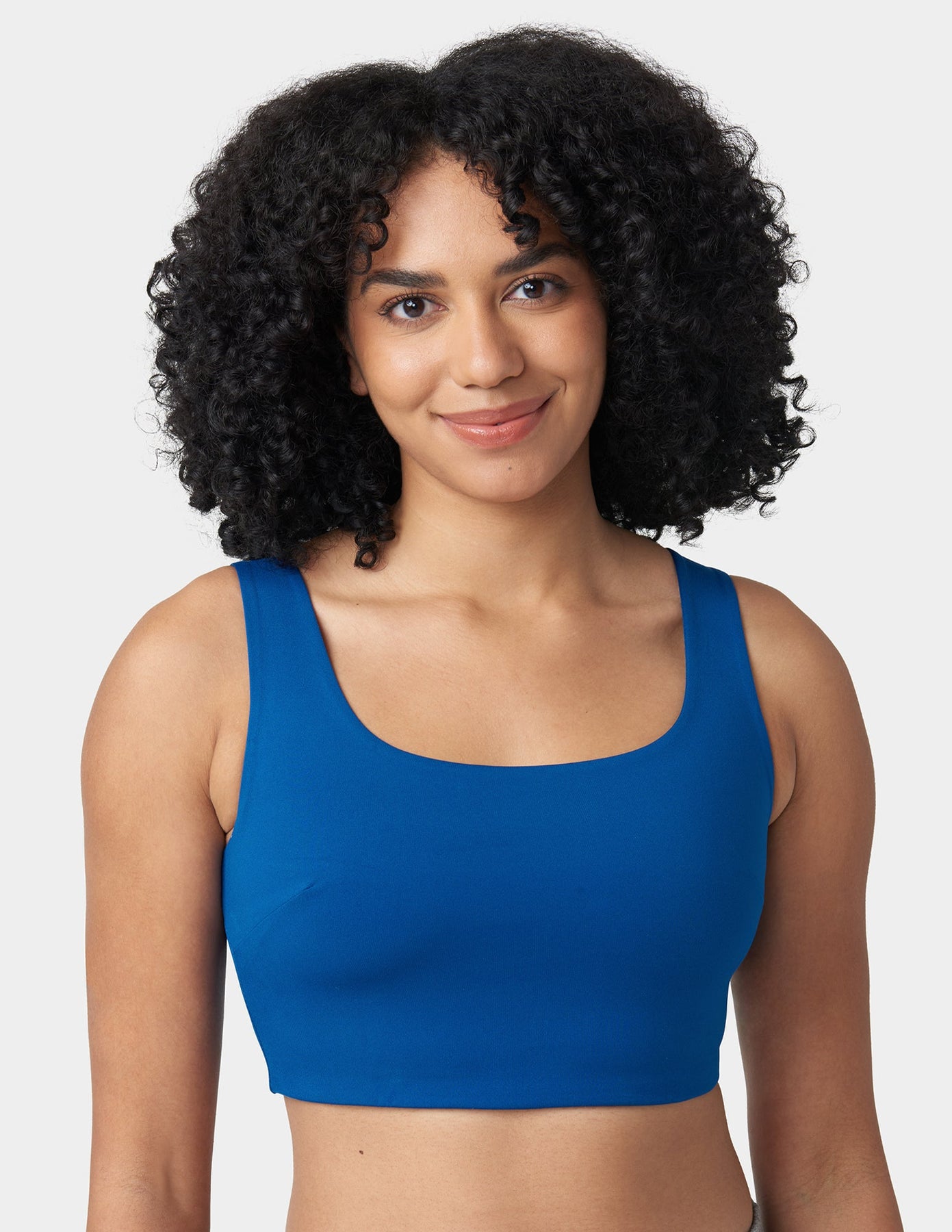 HUE Cropped Full Back Tank Top. A stretch knit cropped top with a built-in bra for support. Features full back coverage.